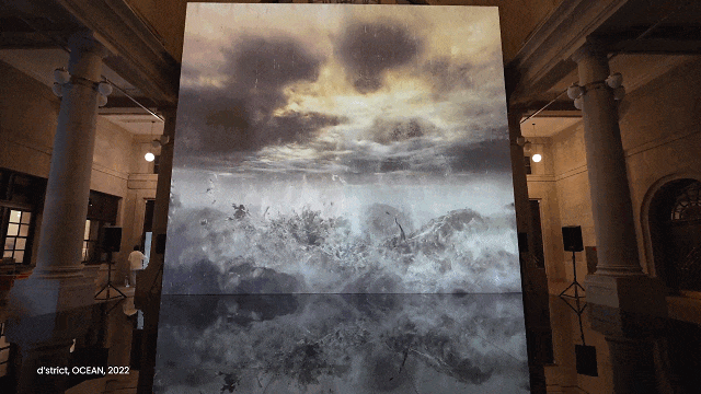 《OCEAN》(2022) 是一个大型投影屏幕装置,为参观者提供了超现实的体验,黑色的汹涌波涛似乎要吞噬沿途的一切。d'strict 与第一代韩国独立贝斯手、著名作曲家、音乐总监和制作人张永圭合作创作的强大音效景观增强了这种体验。