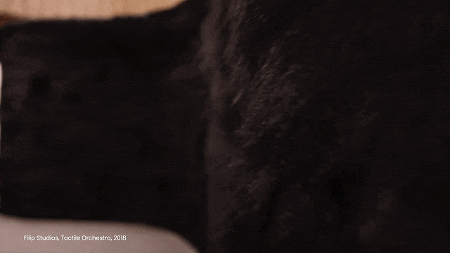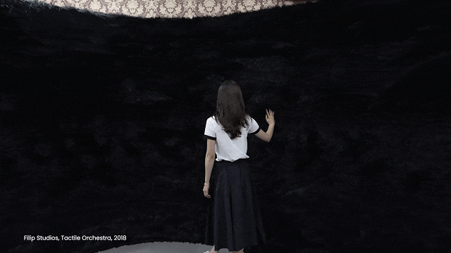 《Tactile Orchestra》(2018)由一个柔软、毛茸茸的表面组成,该表面对触摸有反应,这是一个互动装置,观众可以触摸或抚摸它,以发现各种管弦乐的声音。通过将表面作为乐器进行探索,游客可以一起创作交响乐。